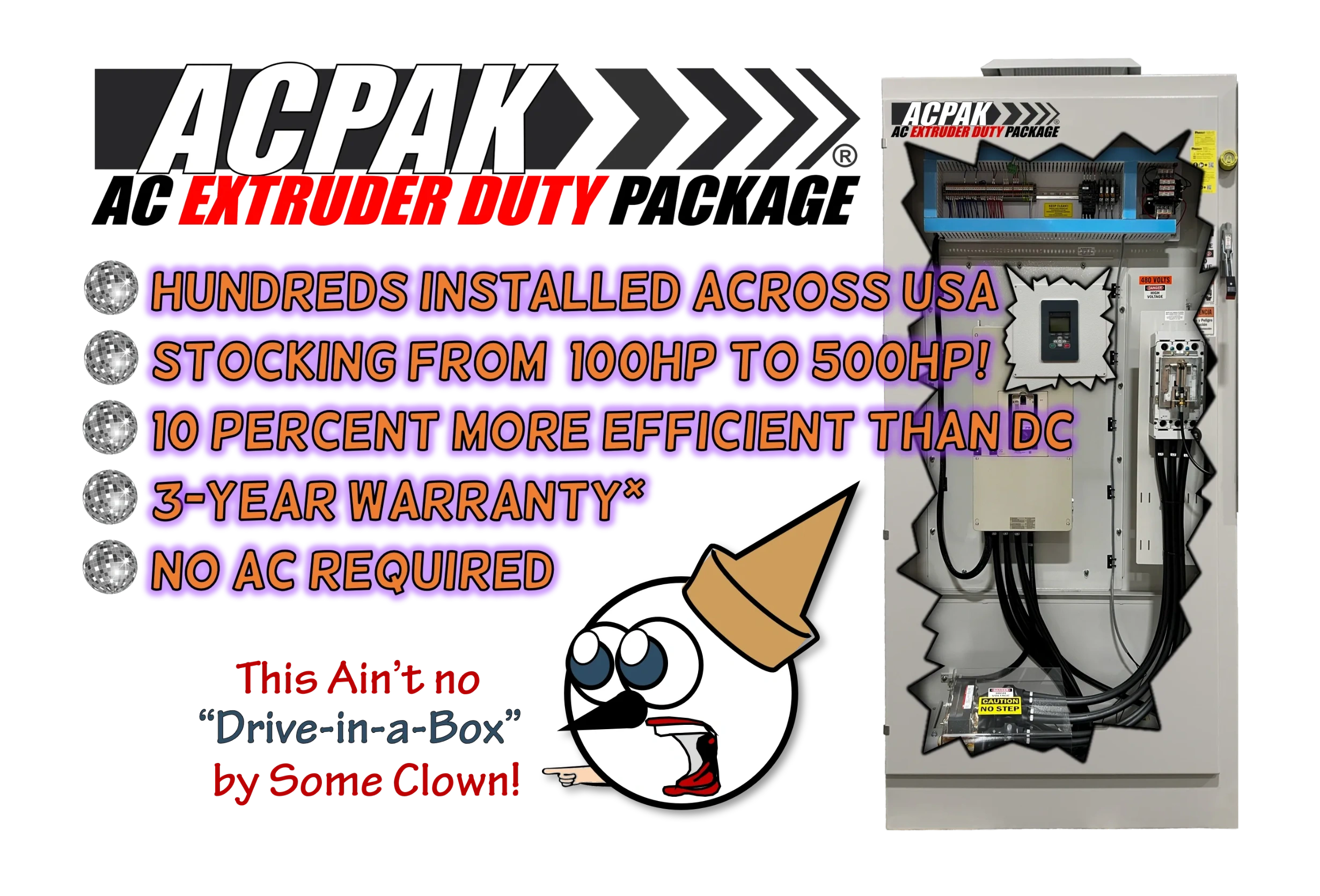 No. DC drives are all “Heavy Duty Rated” for applications such as extruders. AC Drives are both “Normal Duty” and “Heavy Duty” rated. Normal Duty is for pumps and fans and has a 110% overload capacity for one minute, while Heavy Duty is for applications such as extruders which has an overload capacity of 150% for one minute. Therefore, be sure to request AC drives with a Heavy Duty rating of the horsepower that you require.